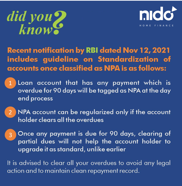 Recent notification by RBI dated November 12, 2021 includes guideline on Standardization of accounts once classified as NPA is as follows: